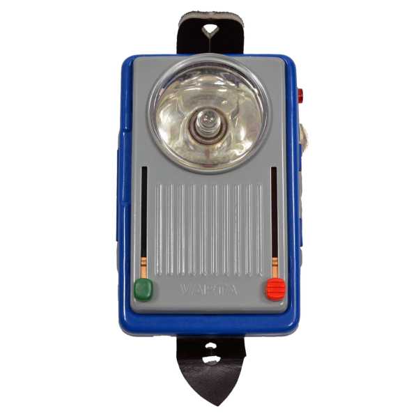 Schiebeschalter mit Morsetaste, zwei Schieberegler für Lichtfilter rot und grün, Lederriemen zur Befestigung am Gürtel oder zum Anknöpfen an die Jacke.