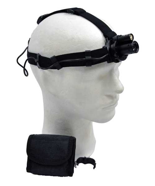 Original Stirnlampe der Deutschen Bundeswehr von LED LENSER Optoelectronics mit Gürteltasche und Schutzklipp für die Einschaltknöpfe.