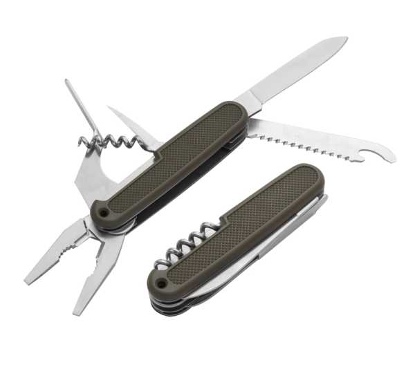 Mehrzweck-Taschenmesser der Bundeswehr in guter Import-Qualität, Griffschalen aus Kunststoff mit Adlerlogo, Messerklinge aus rostfreiem Stahl, Säge mit Sägeschutz, Flaschenöffner und Nagel-feile, Korkenzieher, Pfriem (Stechahle), Zange und Gürteltasche.
